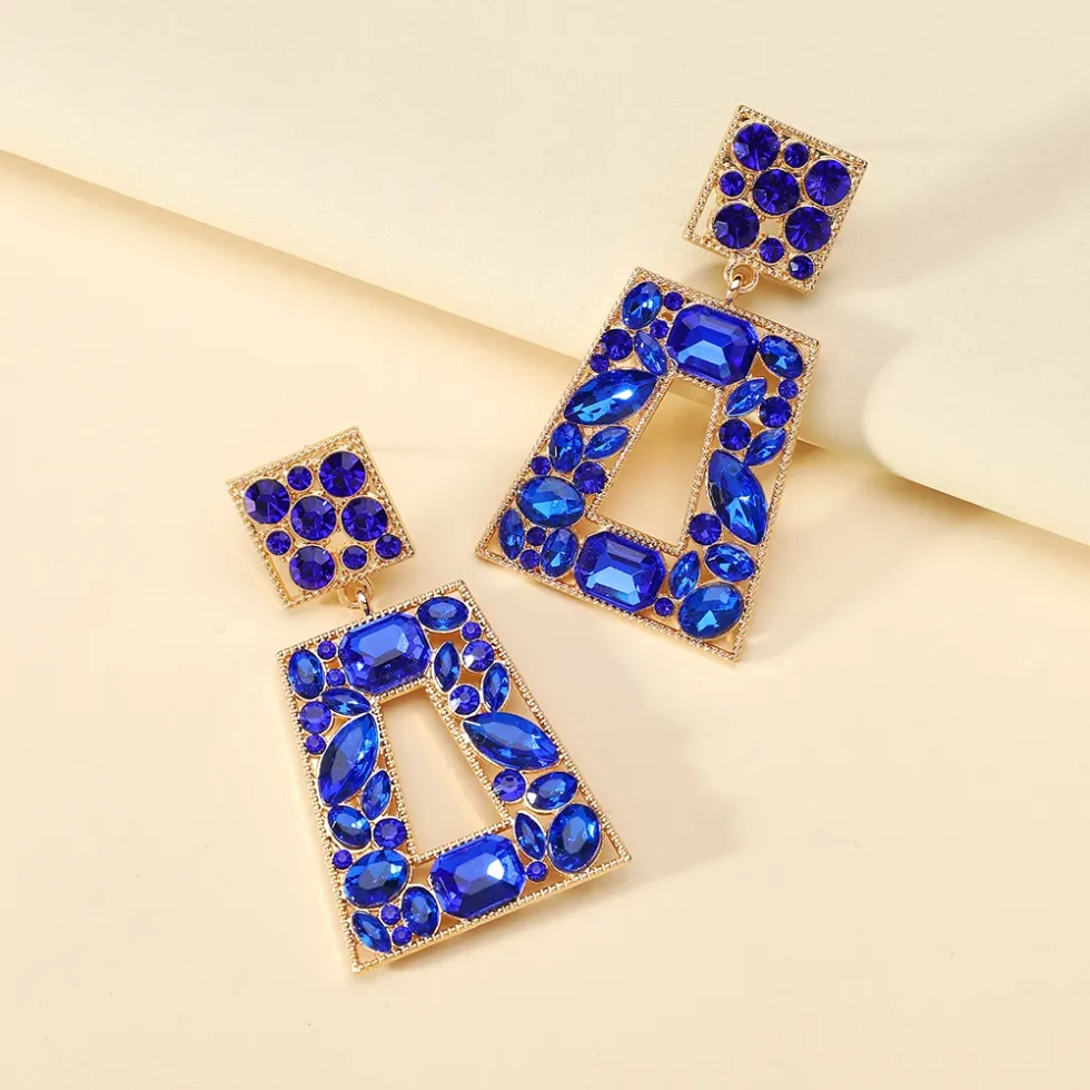 Πρόκειται για ένα ζευγάρι γυναικεία κρεμαστά σκουλαρίκια με γεωμετρικό σχέδιο και πολύχρωμους κρυστάλλους.