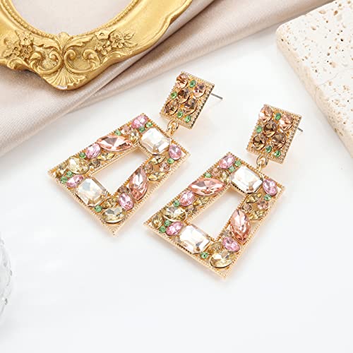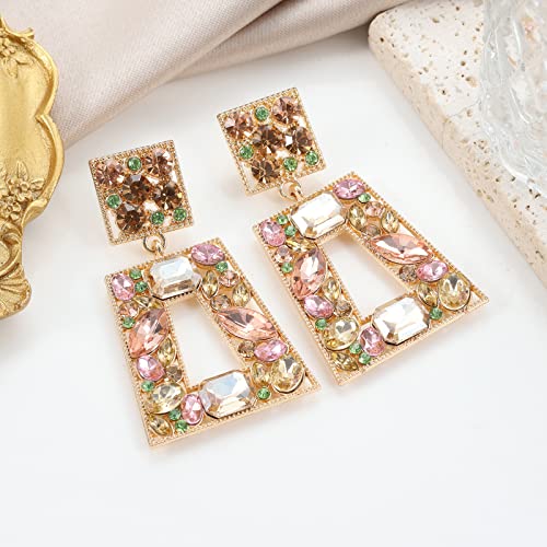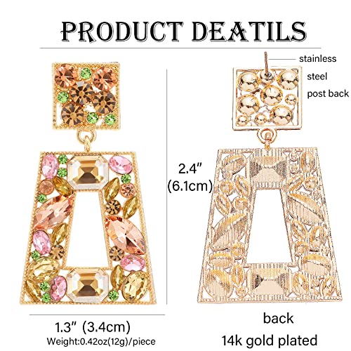Πρόκειται για ένα ζευγάρι γυναικεία κρεμαστά σκουλαρίκια με γεωμετρικό σχέδιο και πολύχρωμους κρυστάλλους.