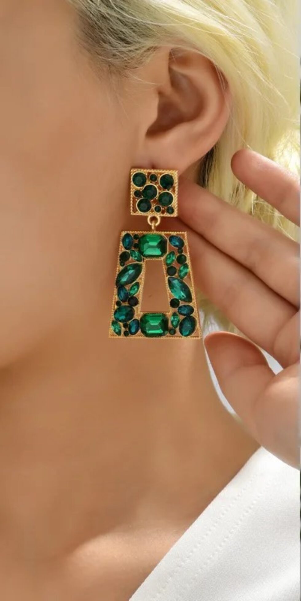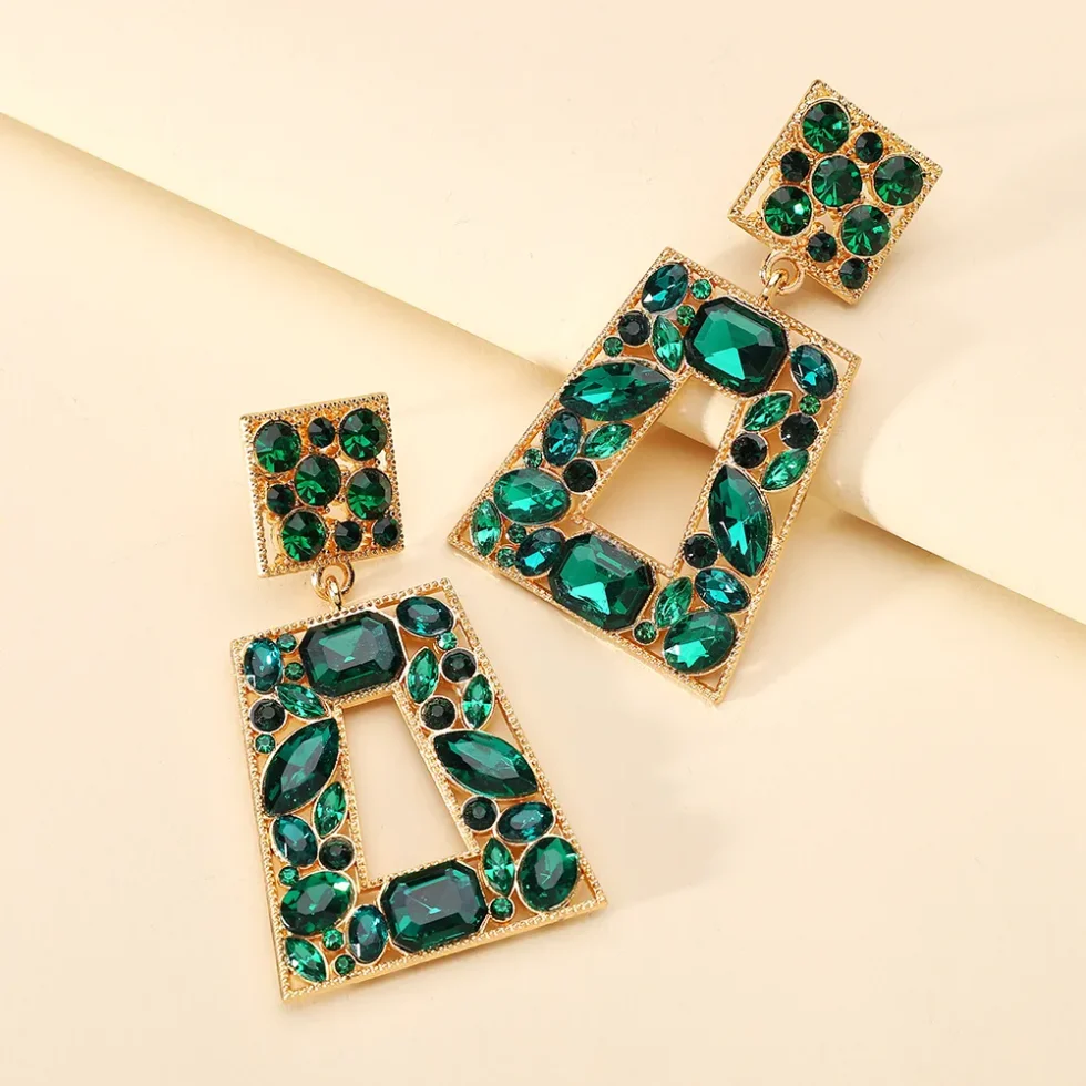 Πρόκειται για ένα ζευγάρι γυναικεία κρεμαστά σκουλαρίκια με γεωμετρικό σχέδιο και πολύχρωμους κρυστάλλους.